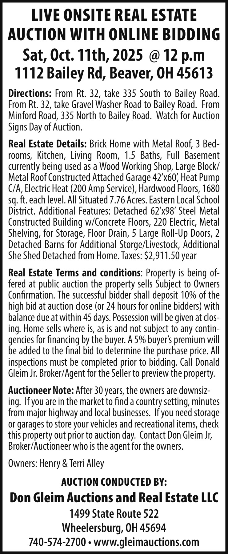 Oct 05, 2025. Don Gleim Auctions and Real Estate LLC Auctions Ads from The Pike County News Watchman