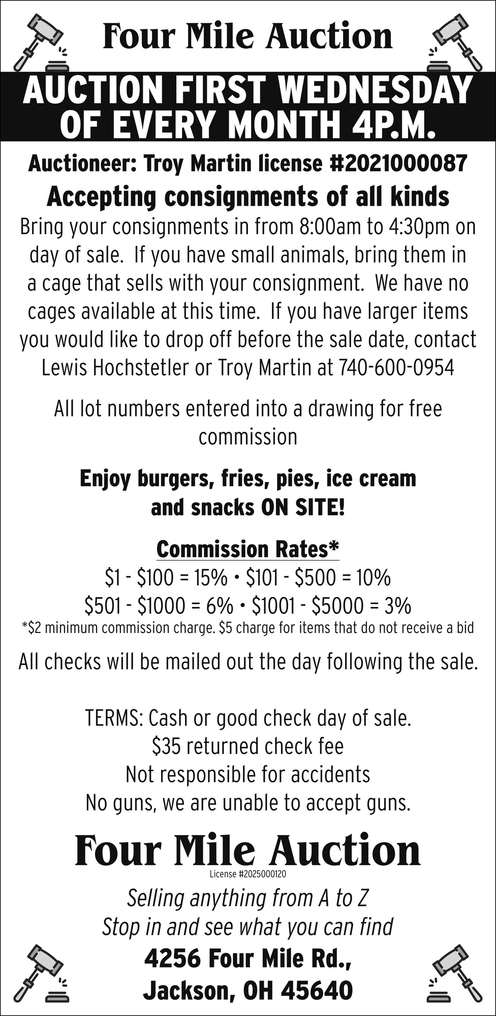 Oct 08, 2025. Four Mile Auction Auctions Ads from The Pike County News Watchman
