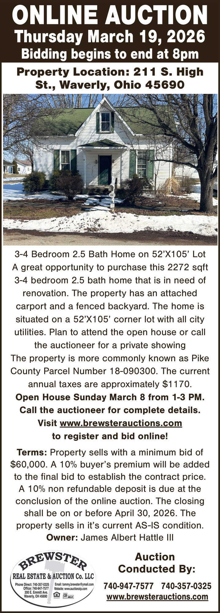 Feb 22, 2026. Brewster Real Estate & Auction Co. LLC Auctions Ads from The Pike County News Watchman