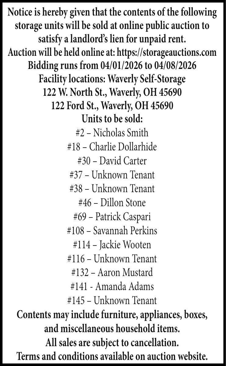 Mar 22, 2026. Storage Auctions Auctions Ads from The Pike County News Watchman